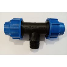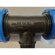 Trójnik przelotowy PE M (GZ) 25-3/4"-25 PN16 do stosowania w systemach nawadniania przy montażu zraszaczy lub innych akcesoriów. Aby trójnik zachował szczelność i parametry pracy należy uprzednio przygotować rurę PE. Do jej przycinania należy używać specjalnych nożyc pozwalających zachować gładkie krawędzie i odpowiedni kształt podczas cięcia. Wprowadzając rurę do rozdzielacza należy upewnić się, że posiada okrągły (nie owalny!) kształt, jest ucięta pod kątem prostym i posiada łagodnie zakończone krawędzie, które nie uszkodzą wewnętrznego o-ringu.