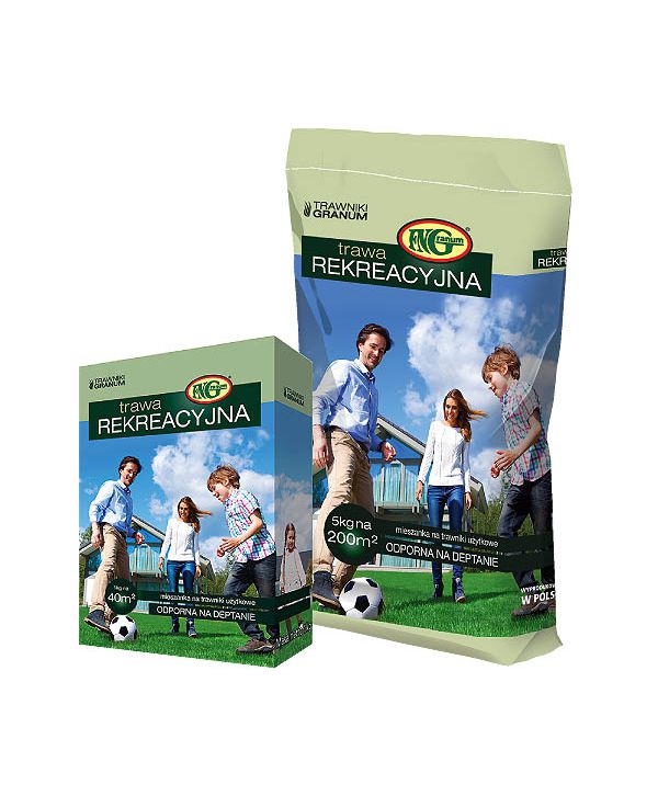 Typowa mieszanka na tereny o umiarkowanie intensywnym użytkowaniu. Polecana jest wszędzie tam, gdzie potrzebna jest zwarta murawa służąca do wypoczynku, relaksu czy rodzinnej zabawy. Mieszanka ta nadaje się również do obsiewu placów zabaw i terenów sportowych mniej narażonych na udeptywanie. Powstały z mieszanki REKREACYJNEJ trawnik, charakteryzuje się estetycznym wyglądem oraz dość powolnym odrostem. Nie wymaga zbyt częstego koszenia. Mieszankę tę polecamy na grunty żyzne i średnio żyzne.