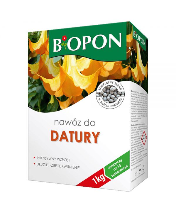Wieloskładnikowy nawóz w postaci granulatu przeznaczony do zasilania datury (bieluń, trąba anielska) – rośliny o bardzo dużych potrzebach pokarmowych. Odpowiednio dobrane składniki odżywcze gwarantują jej prawidłowy rozwój. Zbilansowany skład sprawia, że datura intensywnie kwitnie, ma pięknie wybarwione kwiaty oraz zdrowe, zielone liście. Nawóz zapewnia również optymalne warunki do rozwoju jej systemu korzeniowego.